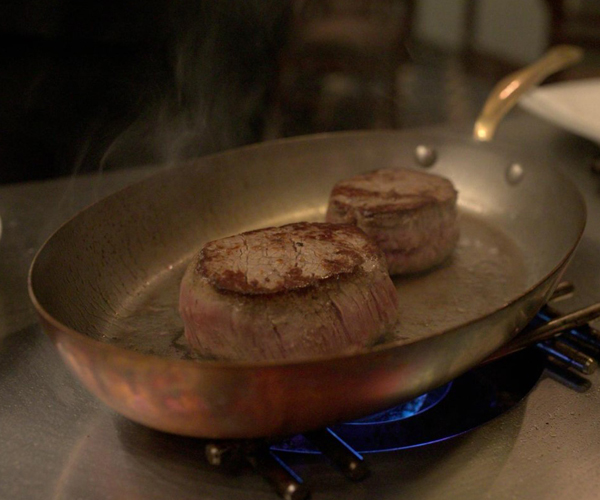At Seagar’s steakhouse the preparation process has been fine-tuned and the tableside presentation has become an experience in itself. It begins with two 5-ounce filet medallions cooked in a copper skillet with butter. After removing the seared medallions the server then sautees the shallots, adds dijon mustard, mushrooms and then flambés with brandy. The brandy de-glazes the pan adding an extra layer of flavor. The server then adds in a heavy cream and veal jus and the sauce is complete. The medallions are placed back in the pan for additional heat and served with the sauce on top, and fresh cracked black pepper.